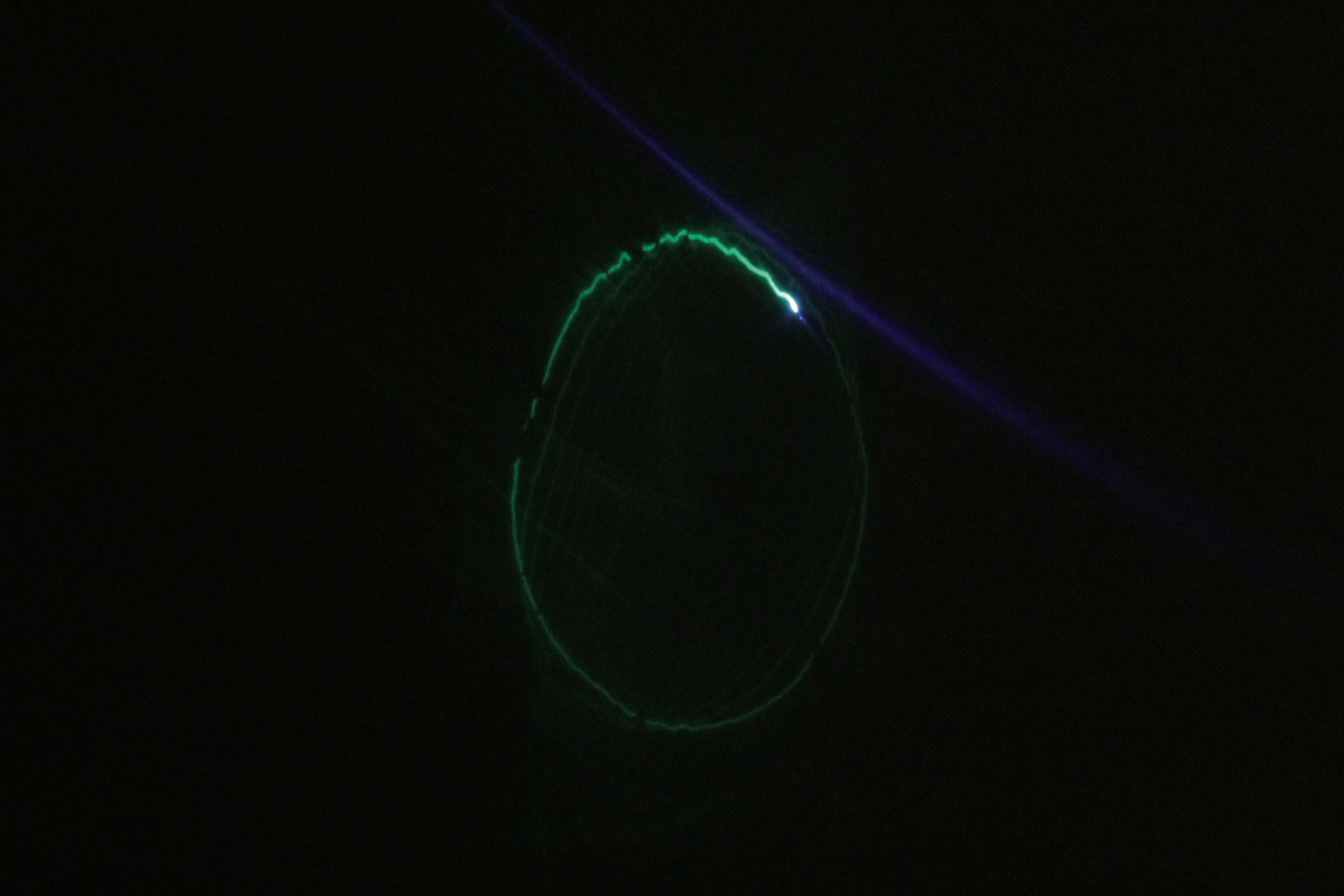 Une comète en fusion, explosant à chaque instant évolue devant nos yeux. Celle-ci laisse derrière elle la marque de son passage par impression photosensible. Le volume de l’orbite se dessine petit à petit et nous permet d’entrevoir l’organisation implicite de sa trajectoire. Malgré que l’on constate un cycle de son cheminement il n’est jamais véritablement le même. Le volume qui se dessine est en constante mutation.